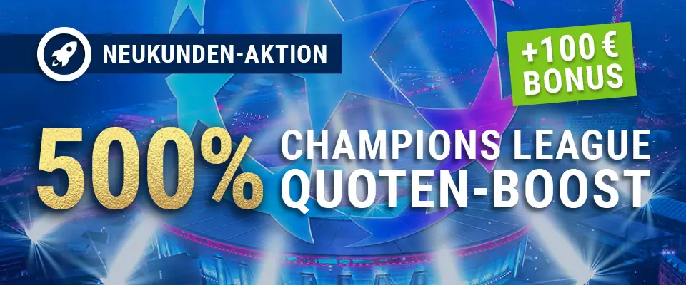 - Der 500 % Quoten-Boost gilt für eine beliebige Prematch-Einzelwette (Mindestquote von 1,20) und kann innerhalb von 30 Tagen einmal als Bonusangebot genutzt werden.